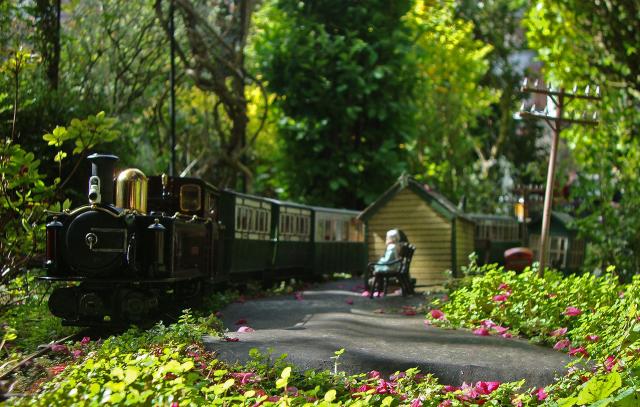The Morris dancers are out for Mayday, but Eastbourne's driver has no time to stop and watch as he departs Splashyng on the Bekonscot Model Railway.