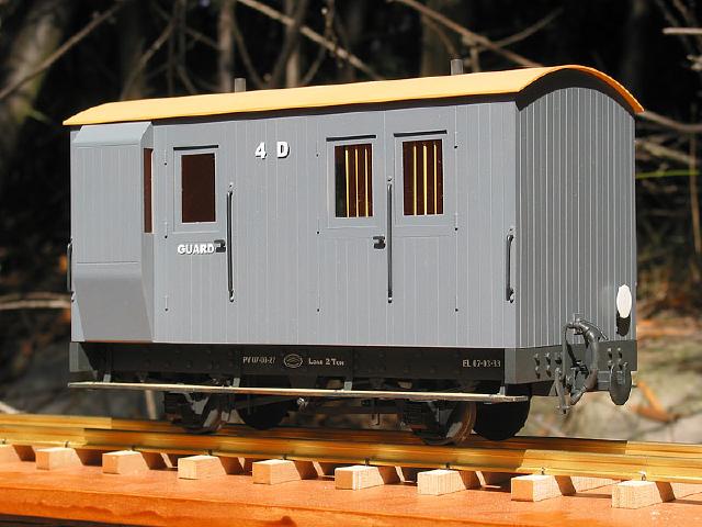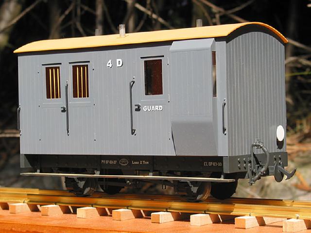 The next pic. shows the detailed body fitted with door hinges and handles, handrails, lamp irons and the roof detailed with a stove chimney and lamp tops, all fitted to the underframe. The air brake hoses were caught up in the Christmas mail jam when the photo was taken, but luckily turned up just before the underframe was painted.