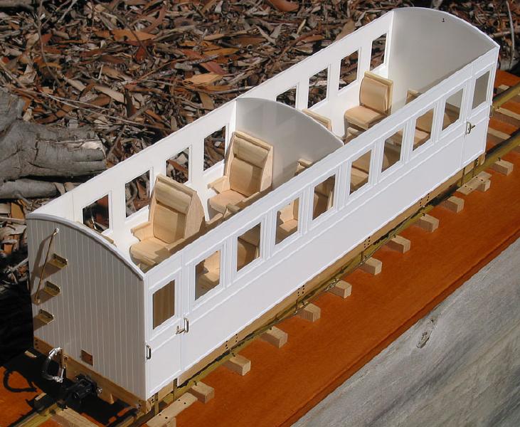 I built three cars, a first-second car and two second with van cars. These will run as a three car set with a van at each end so the train will not need to be shunted, or the van turned at each end of a run. This was standard VR suburban practice for fast turnaround, but less common on country trains and rare on the narrow gauge.
