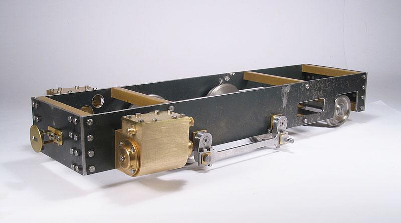 I like to be able to remove wheel sets from the chassis and this time, rather than milling conventional axleboxes, I turned them from square stock and fitted a simple keep that stops them rotating in the chassis. I made the coupling and connecting rod bearings the same way and pressed them into the rods. The photo shows the frame after it was modified to clear the trailing wheels.