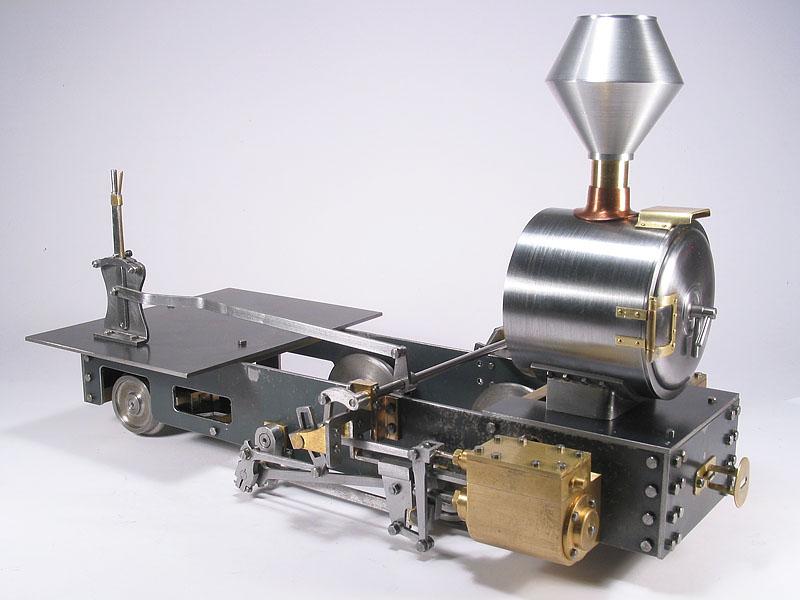 Once it was running on air, it was time to fit the reverser and smokebox. The reverser is more or less standard 'Eric', but the smokebox was made to match the prototype and the smokebox door was made to open. The smokebox was rolled out of 1mm mild steel and the spark arrestor was turned up from a chunk of aluminium to keep the front end weight from getting too heavy. The photo shows it in this state.