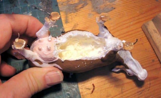 Warning: Do not hold cow in palm of hand while drilling holes in her underside ...... Unless you, too, want perforated palm!