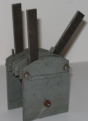 Tonight my fingers, hands, and back are aching from hacksawing, milling, and filing the necessary pieces to fabricate the lever frame. Because McKenzie Holland levers have a bend at quadrant plate level to allow the levers to stand vertically when normal, the blanks had to be cut out of a large piece of 1/8th M.S. plate. The lever blanks have the tongue on the front for the release tangs, to be fitted before shaping the final lever. A curved plate will sit between the levers.