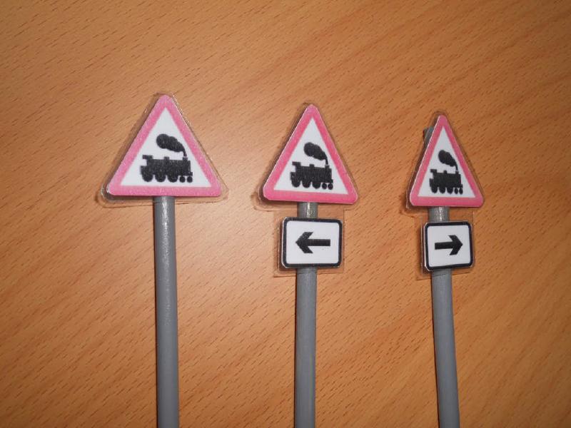 And then there is the business of the level crossing requiring signs. Here they are, ready for installation, firstly the advanced warning signs (three, because of the junction just beyond the crossing):