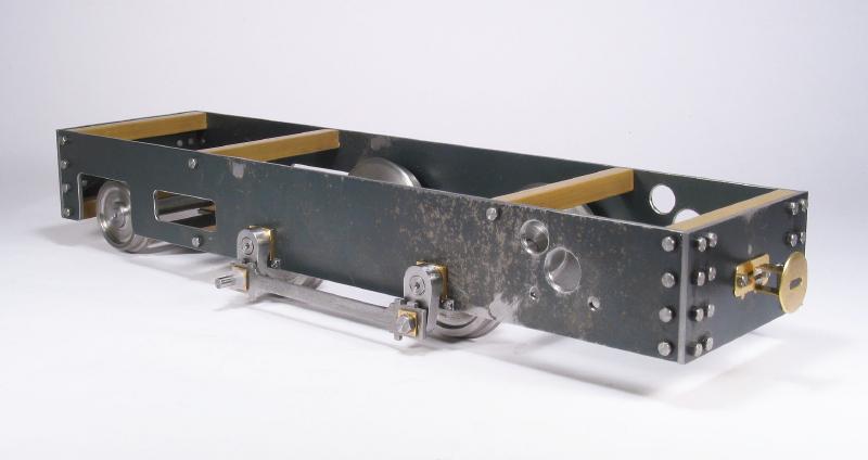 I like to be able to remove wheel sets from the chassis and this time, rather than milling conventional axleboxes, I turned them from square stock and fitted a simple keep that stops them rotating in the chassis. I made the coupling and connecting rod bearings the same way and pressed them into the rods. The photo shows the frame after it was modified to clear the trailing wheels.