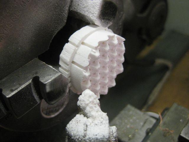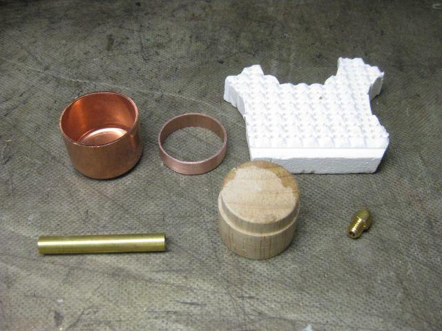 The components; 28 mm stop end, a section of ceramic tile, a piece of 28 mm copper pipe, a piece of K&S brass tubing 1/4" OD and a No.3 gas jet. The piece of wood is a plug for holding the stop end while machining and drilling it.