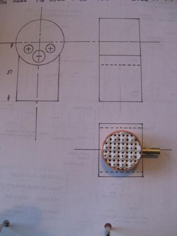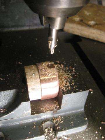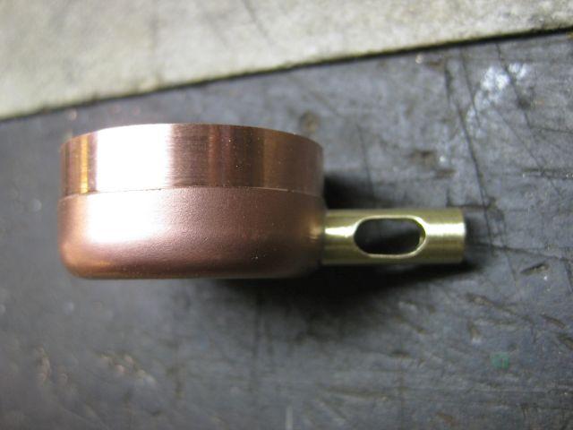The hole for the feed tube was drilled. I find lubricated centre drills do this very well in annealed copper. Slow rpm and a lubricant help.