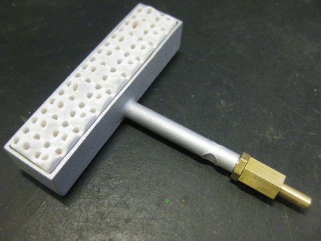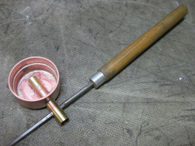 To create the air hole, first a small hole was drilled in the annealed brass tube which was opened out using a broach. For a clear run for the air all burrs must be removed from these holes